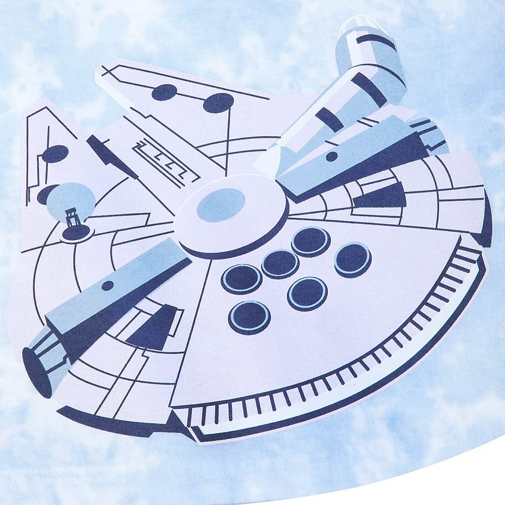 The cotton shirt features a tie-dye pattern, puffy lettering with a purple to blue ombre color transition reading “Star Wars” on the front and “Cloud City” across the back. Finally, Cloud City and Millennium Falcon images also grace the back of the shirt.