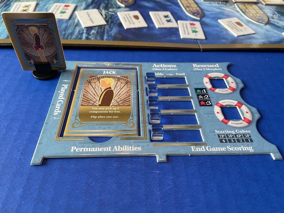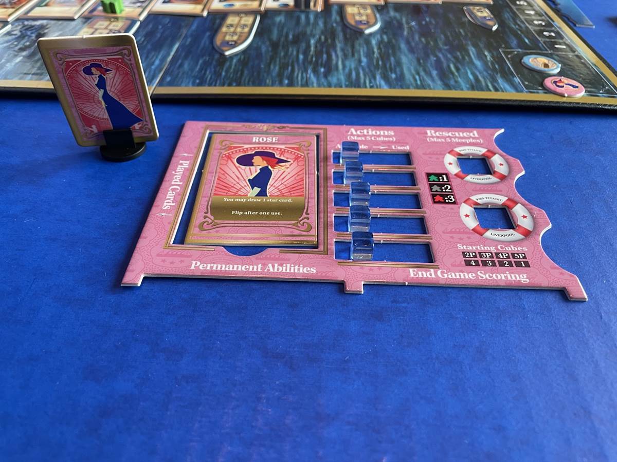 Playable characters include Rose, Jack, Cal, Ruth and the Captain, the only character from the film inspired by a real person aboard the ship. Not using dice, slidable action cubes are used to keep track of the number of actions a player can make during a turn. Each character also has a special ability they can use by flipping over their portrait and the also have two lifesavers on hand to help save passengers with the ability to acquire three more as they move through the ship.
