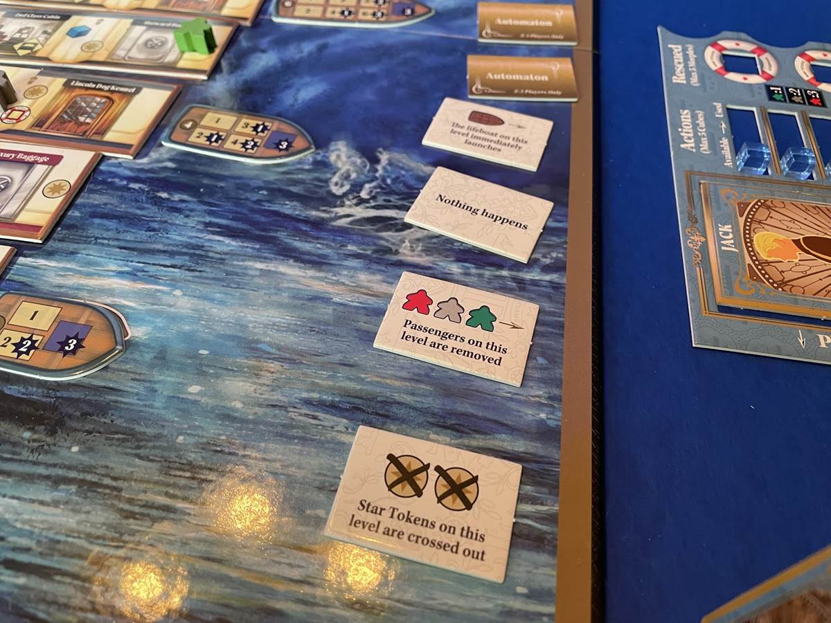 As entire decks are eliminated their tiles are removed and a waterline indicator slides up the board. A player can’t really be out of the game until the last deck sinks if they don’t make it to the last lifeboat, but you do lose points if you’re on a deck that completely sinks.