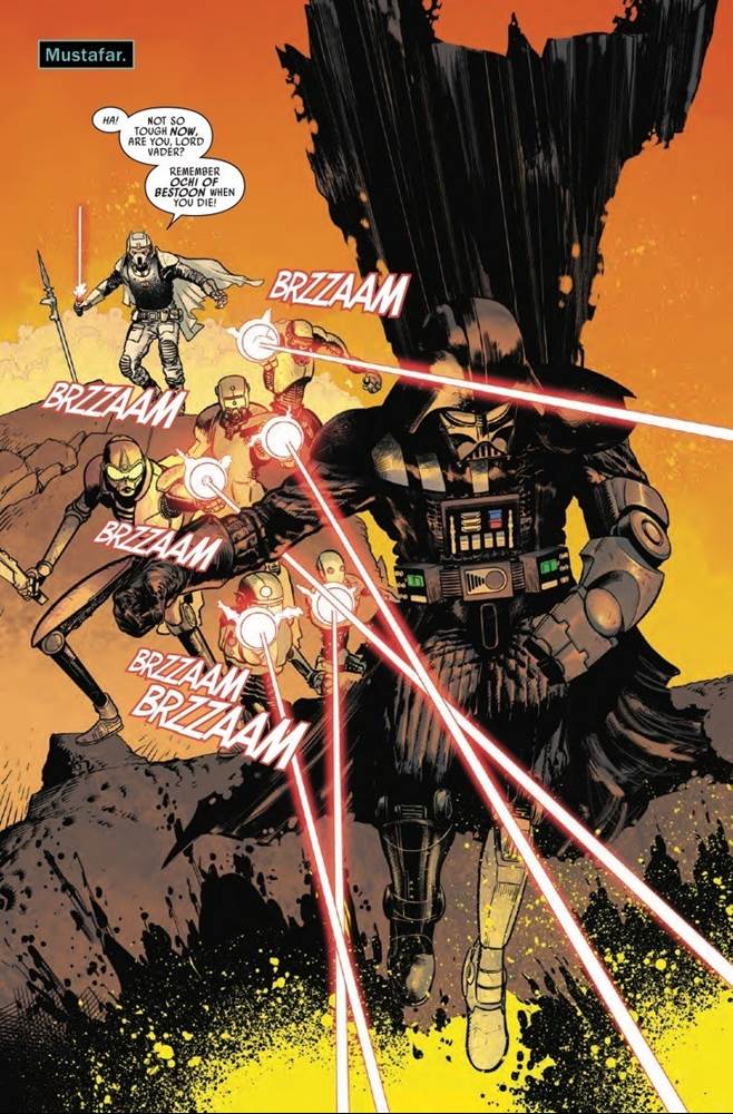Picking up where Darth Vader #8 left off in December, this new issue opens with Vader still stranded on the lava planet Mustafar and being hunted by Ochi of Bestoon, the assassin who goes on to kill Rey’s parents later in the timeline (as seen in Star Wars: The Rise of Skywalker’s flashbacks).