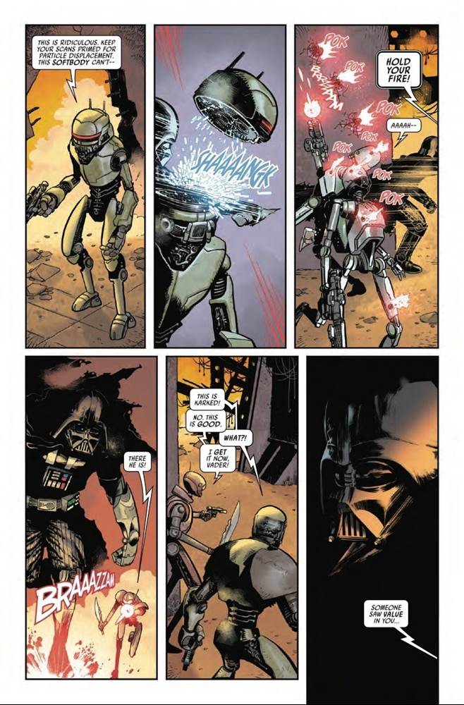 Ochi has sicced a squad of killer robots called the Droid Crush Pirates of Bestoon on Vader, and they spend the issue being thwarted by the Dark Lord at every turn, despite their boasts of superiority and put-downs of Vader’s inferior cybernetic technology and vulnerable organic underbelly. Naturally ol’ Darth makes quick work of these mechanical menaces, despite Emperor Palpatine forbidding him from using his Force powers to escape Mustafar earlier in this arc, not to mention the droids’ attempts to prey on Vader’s psychological insecurities during the battle. And midway through, Vader manages to reclaim his lightsaber from Ochi and wreak havoc on the remaining droids, which was pretty entertaining to see as far as action sequences go.