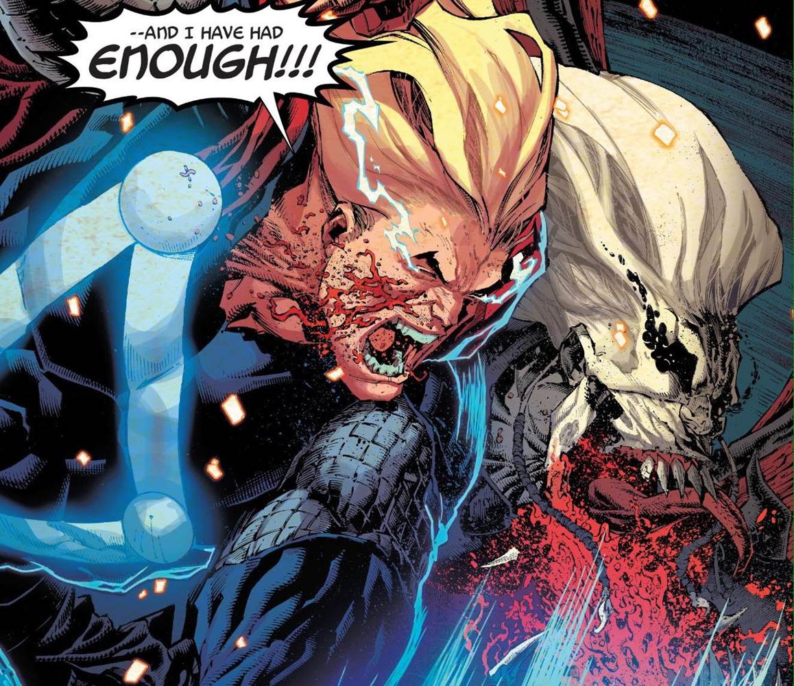 Somehow, this issue still manages to up the ante in terms of action as well. While this whole series has been enveloped in a standoff between Earth’s mightiest heroes and the symbiote forces of the god of the void, this issue highlights one of the biggest fights yet. And it’s really taken up a notch by the involvement of Knull himself.