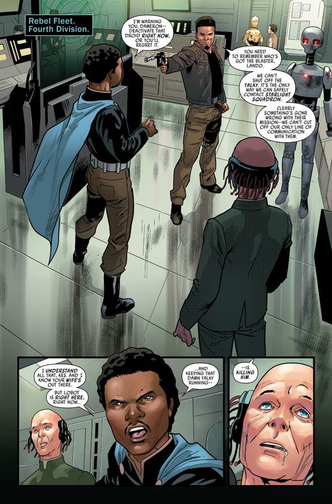 Two deadly standoffs break out in Star Wars #11, which came out today from Marvel Comics. First, Lando Calrissian demands that Kes Dameron (Poe’s father), Princess Leia Organa, and C-3PO release his friend Lobot, who is in danger of having his cyborg brain fried by the ancient droid they’re using to create a new rebel code.