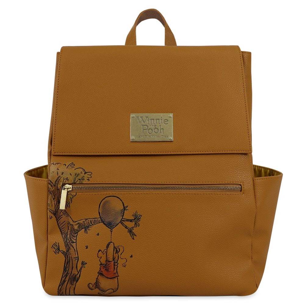 Travel in style with this roomy faux leather backpack. A sketch of Pooh floating to the honey tree graces the front of the bag which also houses a zippered pouch. The bag features a zip closure under the top flap, two side snaps to allow for more room, two side pockets, and a lined interior.