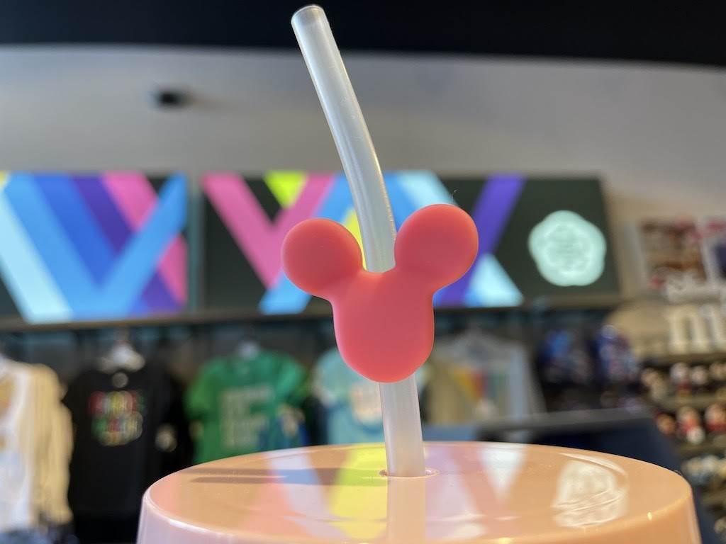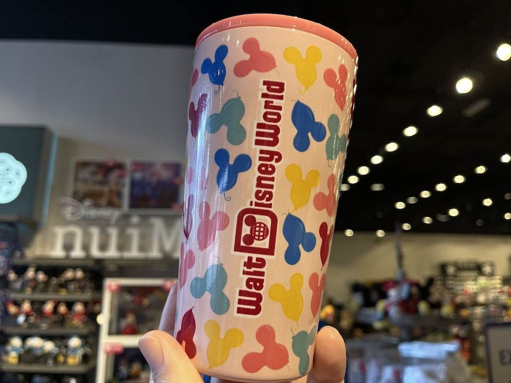 One of our favorite souvenirs available to guests are colorful Mickey Mouse balloons. This clear tumbler has several balloons “floating” along the outside of the cup along with the original Walt Disney World logo, but the real winner here is the balloon clip attached to the straw.