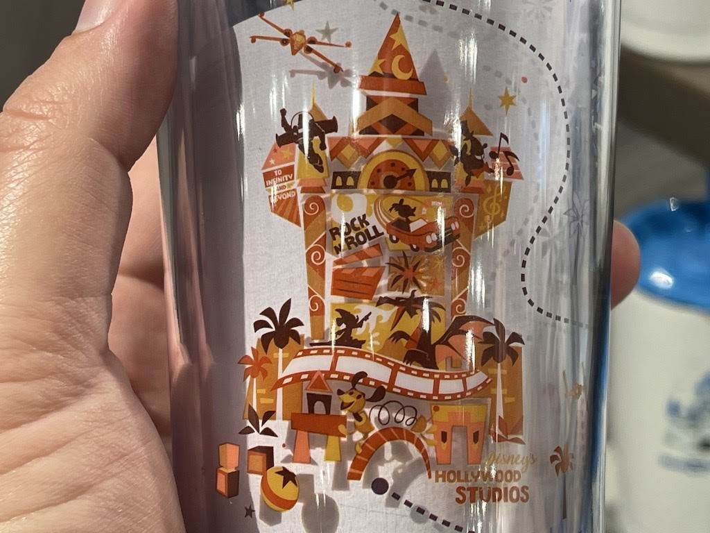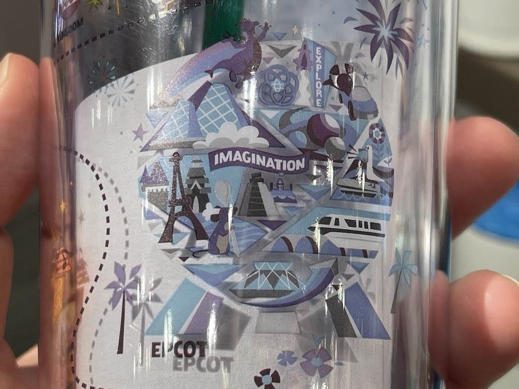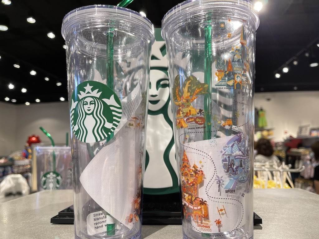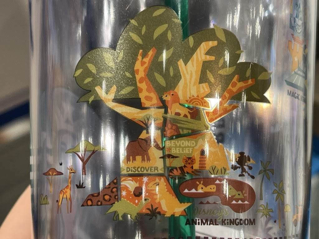This might be our favorite one yet! At first glance it looks just like a “cold drink” cup one would find at Starbucks (complete with green straw), but when you look again you’ll see it has icons of all four Walt Disney World parks!