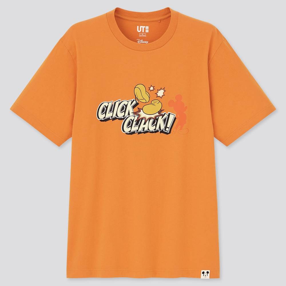 If you’ve ever wondered what sound Mickey’s shoes make when he walks, now you know it’s “click click!” Well at least that’s true when he’s dreaming as depicted on this orange graphic tee.