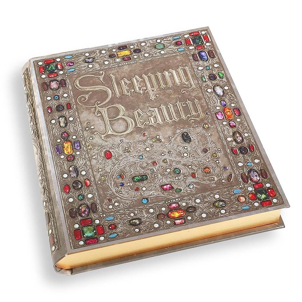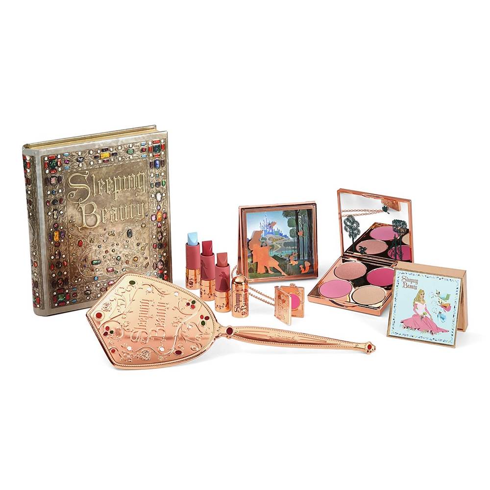 While lipsticks, and eyeshadows would indeed be included with the Sleeping Beauty set, one of the additional signature pieces was a handheld mirror. The design was inspired by the storybook as well as the title princess. The back of the mirror featured the same script as “Sleeping Beauty” as well as a long handle to indicate Aurora’s long and lean figure. Gabriela also reproduced the storybook for the collection and added a pedestal in the same style.