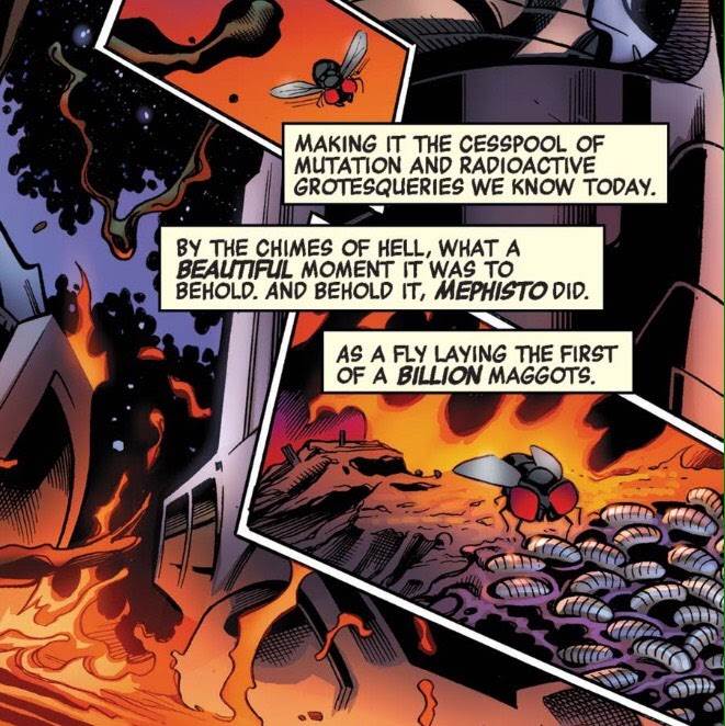 In “Avengers #18,” which was released late last year, it was revealed that Mephisto watched a diseased Celestial die on the newly formed Earth while he was taking the form of a fly. In that same issue, he goes on to take the shape of other animals as well. Perhaps he has been hiding in plain sight in WandaVision, as we have seen plenty of animals throughout the series. The lobster, the stork and who knows what else could have actually been this demon taking on another form.