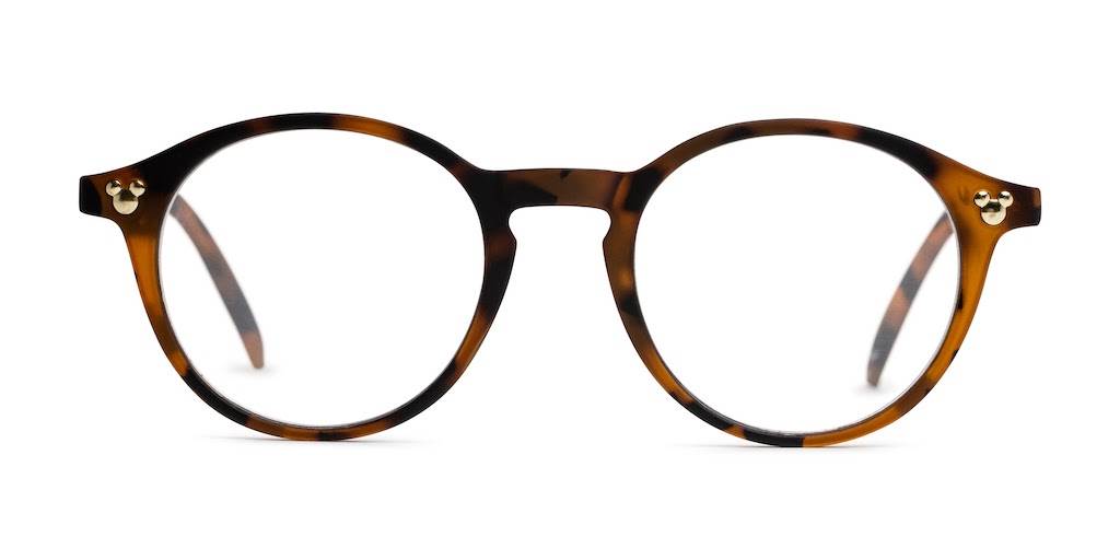 “This round frame with Mickey-shaped metal rivets is as classic as the True Original himself. Delight in the simplicity of a brown tortoise frame or surprise in navy with pops of red and a Minnie Mouse bow print on the inner temples.”
