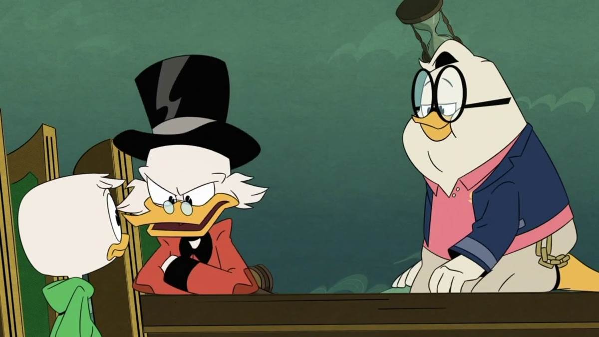 The episode opens with nephew Louie (voiced by series regular Bobby Moynihan) having unleashed a decidedly Tribble-esque menace on McDuck Mansion and Scrooge (David Tennant) trying to teach the lad to take responsibility for his own actions, just before the two relatives are whisked away to an ethereal realm known as Karmic Court. There, prosecutor Doofus Drake (John Gemberling from ABC’s Mixed-ish) forces Scrooges to stand trial against three of his greatest enemies: Flintheart Glomgold (Keith Ferguson of Foster’s Home for Imaginary Friends), Ma Beagle (character actress Margo Martindale of August: Osage County), and Magica De Spell (English comedian Catherine Tate, who also appeared alongside Tennant on the BBC’s Doctor Who).