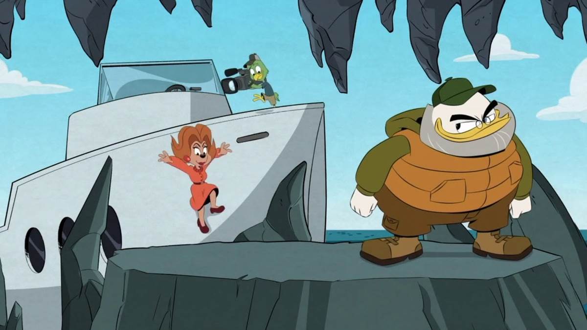 Doofus’s legal strategy is straightforward: he claims Scrooge to be the cause of the villains becoming, well, villains, and demonstrates this by playing a series of flashbacks on a seemingly omniscient movie screen in the courtroom (how any of this works or how Doofus managed to figure out how to take advantage of this system doesn’t really matter-- the audience is asked to just kind of accept the premise and move on, which is fine. It works in its own magical-surrealism DuckTales kind of way). The first flashback shows us how Scrooge outsmarted Glomgold during a treasure-hunting quest and managed to accidentally become beloved on top of already being the “Richest Duck in the World” along the way. He saves reporter Webra Walters (another Easter Egg holdover from 1987’s original Disney Afternoon DuckTales, now voiced by Kari Wahlgren of Rick and Morty)-- who Flinty had left to die in shark-infested waters-- and claims a treasured jewel in one agile movement.
