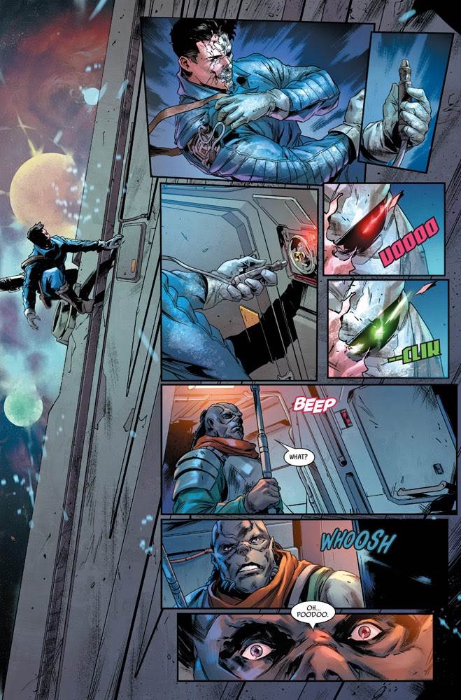 The issue-- which represents Part 3 of “The Terminus Gauntlet” arc, subtitled “A Desperate Gambit”-- opens with another flashback to Valance’s time as an Imperial cadet, or more accurately the end of that period in his life. We learn that the now-cyborg future bounty hunter was actually fairly appreciative of young Han Solo’s attempt to save his life, though Solo doesn’t stick around long enough to hear him give thanks. Cutting back to the “present” (set between the events of The Empire Strikes Back and Return of the Jedi), we see Beilert clinging to the exterior of the rebel ship, before breaking inside and taking out the space pirates one by one, John McClane-style. Meanwhile, we get an update on the status of the recovering T’onga and her girlfriend Losha, who vow to avenge the death of their friend Nakano Lash, who died in a spaceship explosion after a confrontation with Boba Fett five issues back. Plus, we get to know some of the rebel soldiers helping Valance clear out the gang, find out why Dengar is being held captive, and see Beilert’s reaction when he finds out what happened to Han Solo at the end of Empire. Seems like everyone is about to enter into pursuit of a certain Mandalorian-armored bounty hunter in upcoming issues.