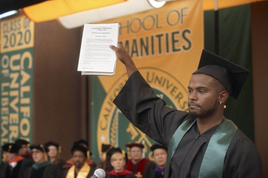 Instead, Aaron heads to the podium to complete one final protest. He reveals to the crowd the bribe and NDA the Dean offered him in exchange for dropping the fight against the school funding privatized prisons. As the crowd is left stunned, the entire student body disrobes to reveal they are wearing orange prison jumpsuits in solidarity. The image, just like the previous protest, is stunning and powerful.