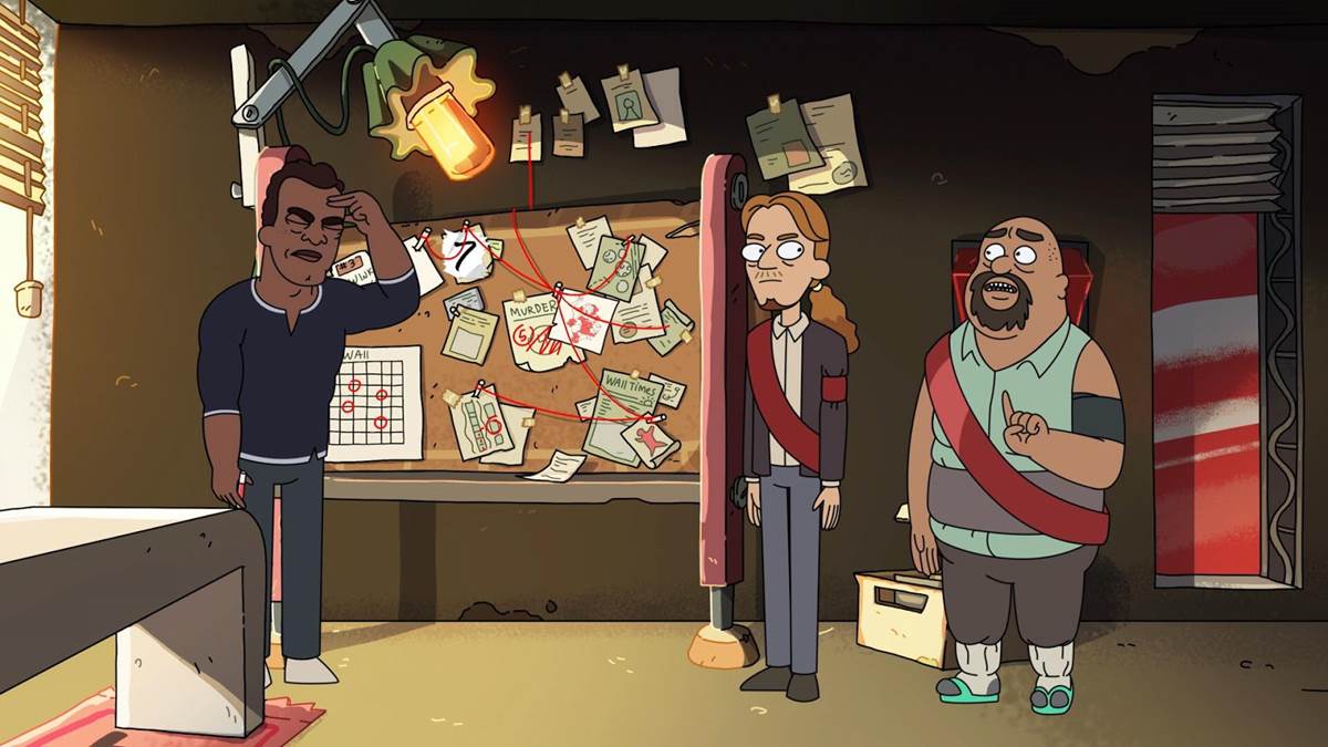 It’s all pretty consistently amusing, and since the series began I’ve gotten a big kick out of how it leans into Roiland’s very specific sphere of pop-culture awareness via the wisecracking character of Terry, but to me the hidden appeal of the show lies in its commitment to dramatic (and almost post-apocalyptic) storytelling via the Wall. The relationship between the two drastically different tones is a symbiotic one, as the Wall couldn’t exist without the aliens’ shenanigans-- nor would we want it to-- and the contrast can be jarring to the point of distraction, but I’m guessing that’s kind of the point, and it absolutely works. Both seasons of Solar Opposites so far have served up a penultimate episode that focuses in almost exclusively on the goings-on within the Wall, and those installments have functioned as both welcome reprieves from the madcap misadventures of the self-applied title characters and pieces of an intriguingly unfolding mythology in and of itself. At first, this year’s story in the Wall involves a shrunk-down ex-TV police-procedural writer (recurring guest star Sterling K. Brown) getting drawn into becoming the lead investigator in an apparent serial killer case, only to gradually stumble across something far more sinister.