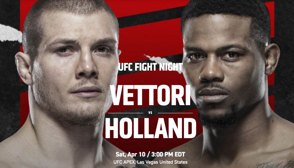 UFC Fight Night: Vettori vs. Holland will be held Saturday, April 10 at 3 PM ET. Fight fans can watch live on ABC and ESPN+.