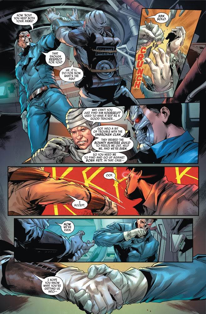 Enter Star Wars: Bounty Hunters #11, out today, which sees Dengar reluctantly teaming up with his captor Beilert Valance to track down their mutual competitor Boba Fett, who has recently taken the carbonite-frozen Han Solo aboard his ship the Slave I. As we’ve learned in flashbacks over the last couple issues (and in the Han Solo: Imperial Cadet miniseries from a few years back), Valance owes Solo a favor, and he’s evidently intent on paying it back by rescuing the smuggler from the clutches of the deadly Fett and his boss Jabba the Hutt.