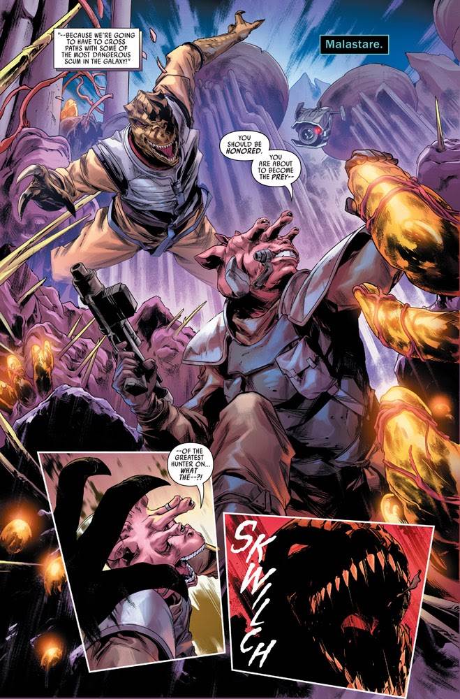 After this issue establishes Valance and Dengar’s uneasy alliance, it cuts immediately to the planet Malastare (first mentioned in Star Wars: Episode I - The Phantom Menace as a hotbed for dangerous podracing), where the notorious Trandoshan Bossk has entered into a Hunger Games-esque battle royale to the death between bounty hunters. As both a highly skilled tracker and assassin, Bossk easily takes out his prey one by one while a “Malastare Hunting Club'' regular named Exum Jermit watches on, intent on swiping in at the last minute with a crew of ringers and winning the contest for himself. Also hanging around Malastare is Jabba’s majordomo Bib Fortuna, who wants Jermit to switch alliances from a mysterious client to the Tatooine-based Hutt crimelord. Long story short, Bossk ultimately proves his superiority in combat (at one point overpowering the imposing Dowutin hunter named Grummgar, who of course survives the battle and goes on to appear at Maz Kanata’s castle in Star Wars: The Force Awakens), eliminates Jermit, and reconnects with Fortuna, who it turns out had hired him to win the competition on Jabba’s behalf.