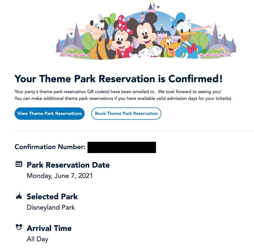 You should receive an email with this same information. After your session is complete, you will need to wait through the virtual queue again to view your reservation on Disneyland.com, but a simple workaround is to use the Disneyland app, which presents your reservation information at the top of the home page.