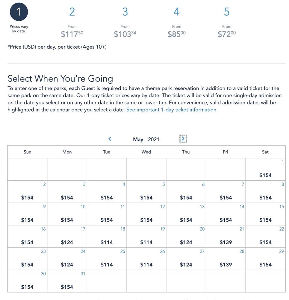The demand-based pricing disappears when adding extra days, which then presents you with a more simplified view of the number of tickets and how much it will cost with or without the park hopper add-on.