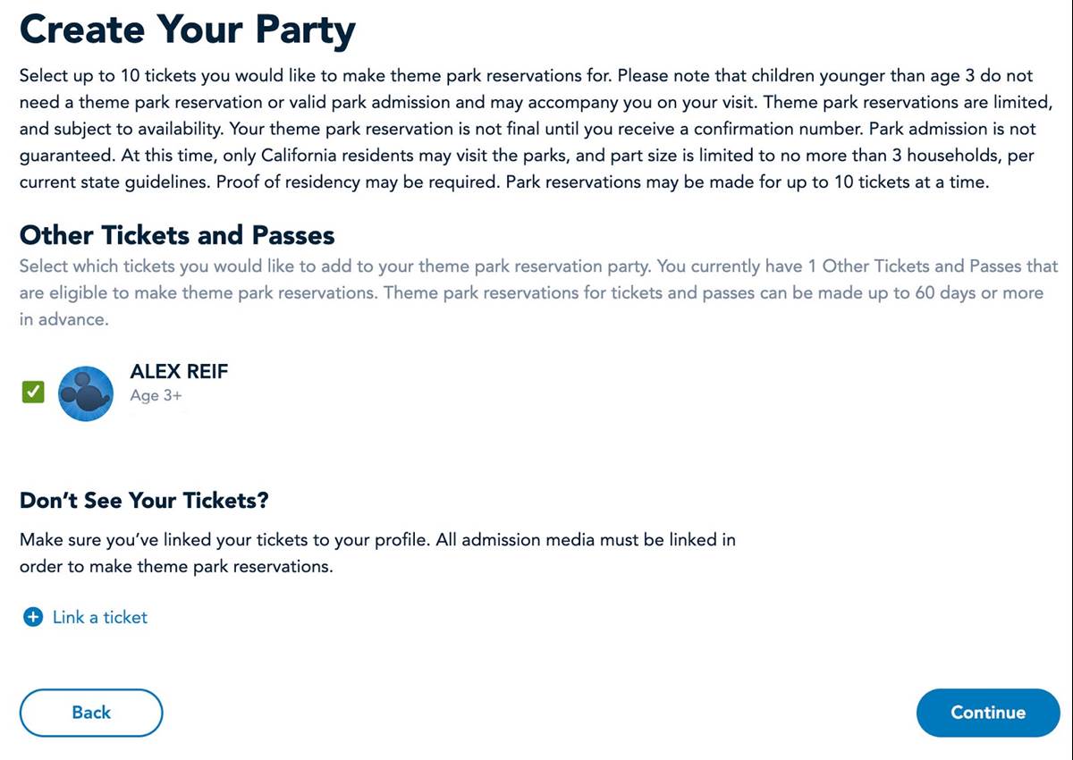 Finally, at the end of all that, you can “Create your party” by selecting or adding the names of the people who will be using the tickets. If you have a member of your party who already has their ticket, you will need the ticket number in order to link them to your reservation, which you’ll be making in the next step.