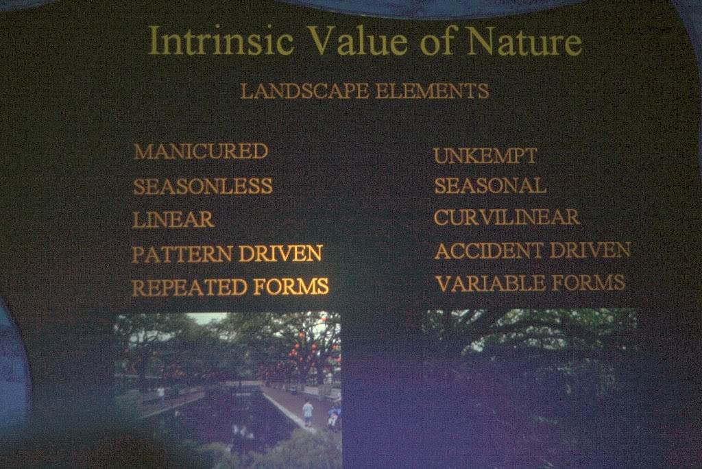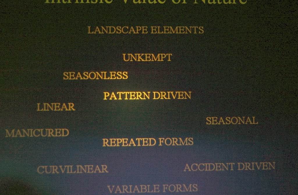 Evaluating the lists on the left and the right -- you would select the right list to illustrate the value of nature. They reflected the message of nature in the landscape by selecting a more unkempt, less linear style, permitting natural patterns to take place.