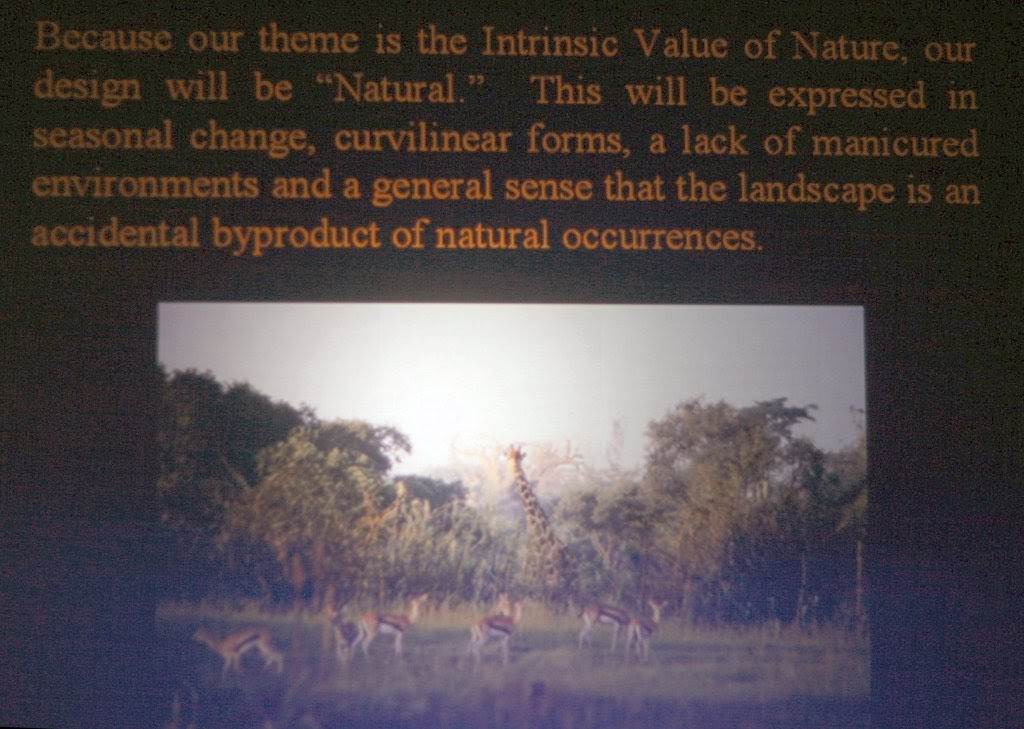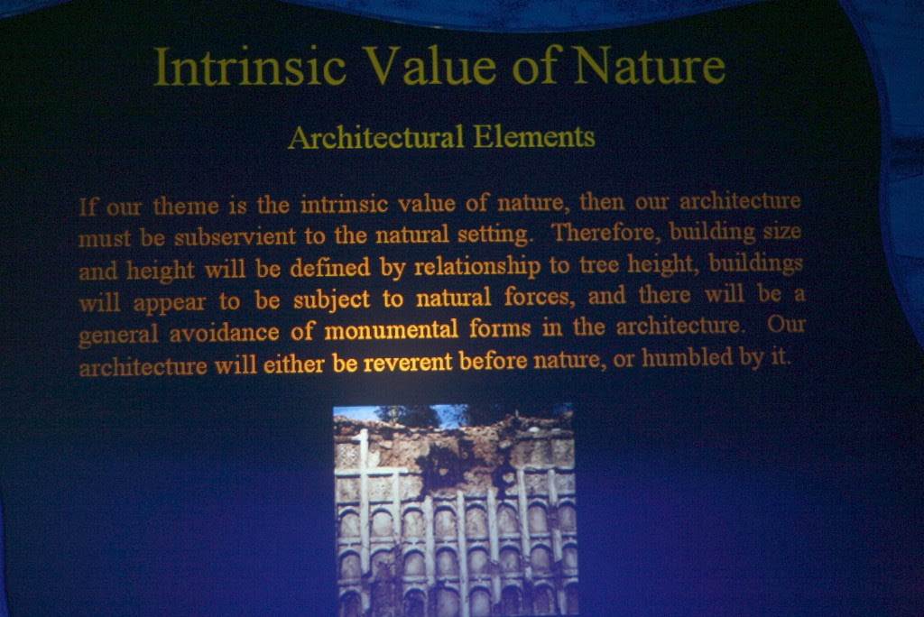 In determining the theme of Disney's Animal Kingdom they identified their key message -- the idea that nature itself has a value that is a greater value than the value of anything else you can put on the other side of the balance. Nature's value is greater than money. Nature's value is greater than convenience.