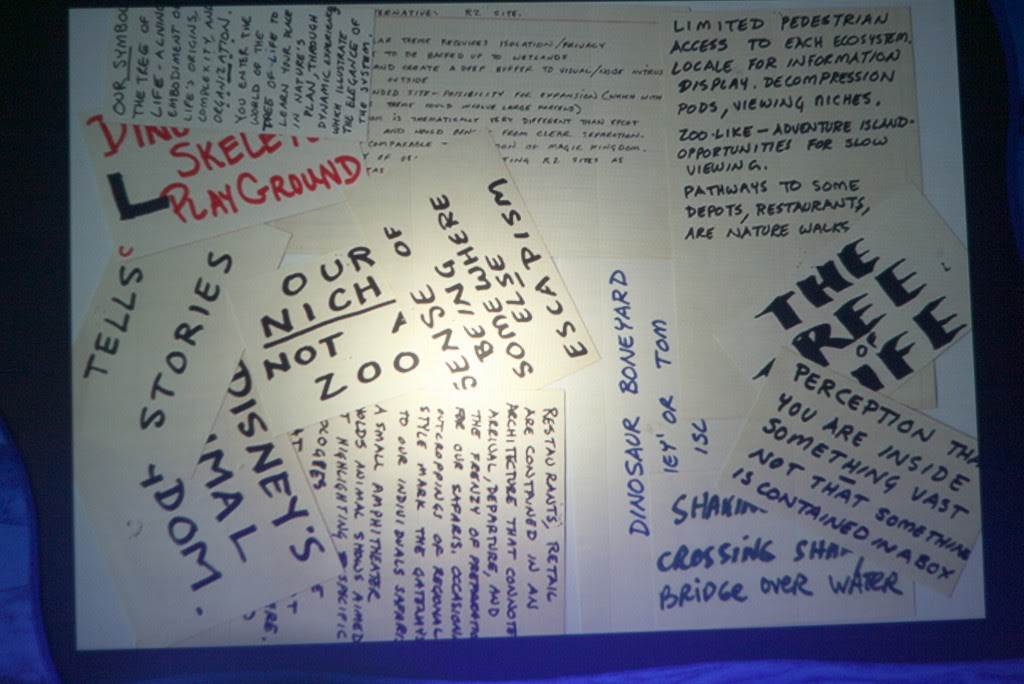Joe Rohde shared an image of the cards that feature the ideas of the imagineers as they developed Disney's Animal Kingdom.Diagraming out the story of Disney's Animal Kingdom. Looking at the park's values and its opportunities they would develop