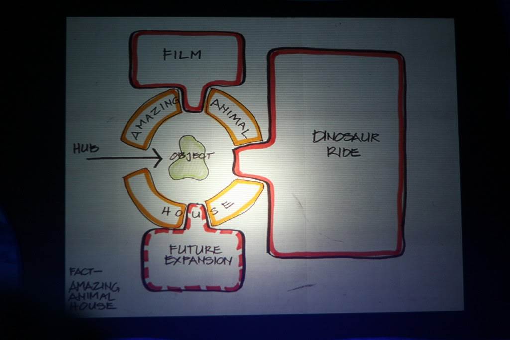 The theme of the universal love of animals that one way or another, whether it's a live animal or an imaginary animal, a prehistoric animal a storybook animal, one way or another there's a form of the animal world that brings people emotionally alive and were used to bring people into contact with this idea. The development of these themes and ideas happen before they begin ride development, shows, and other park elements.