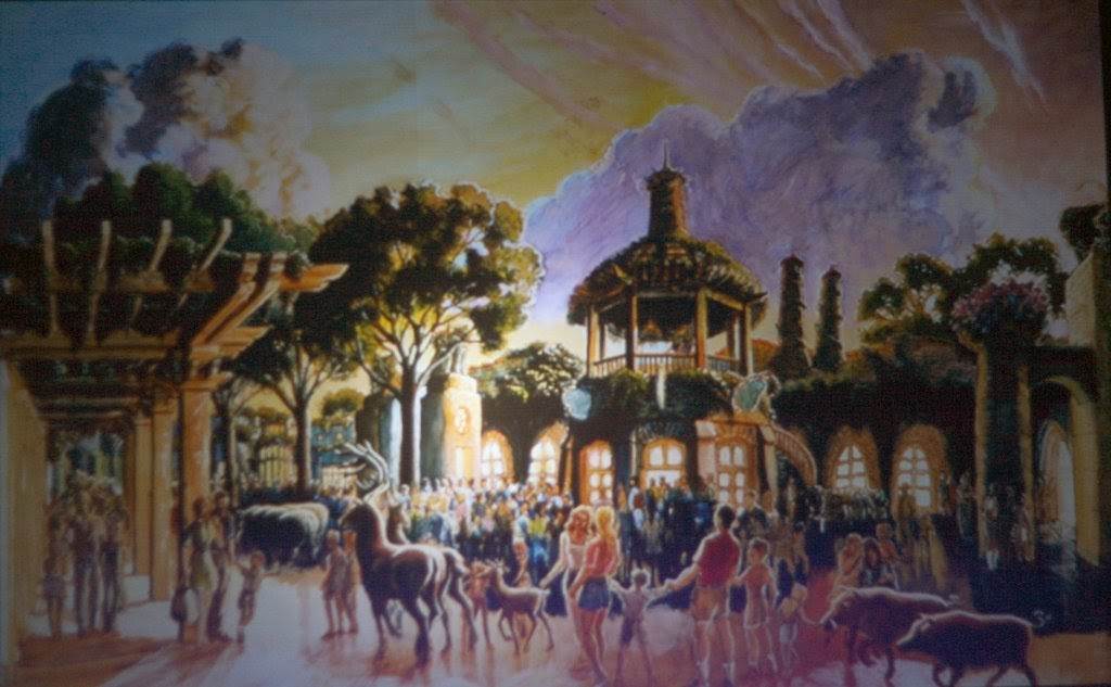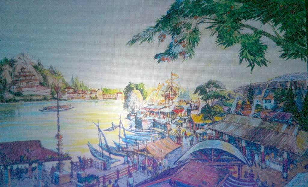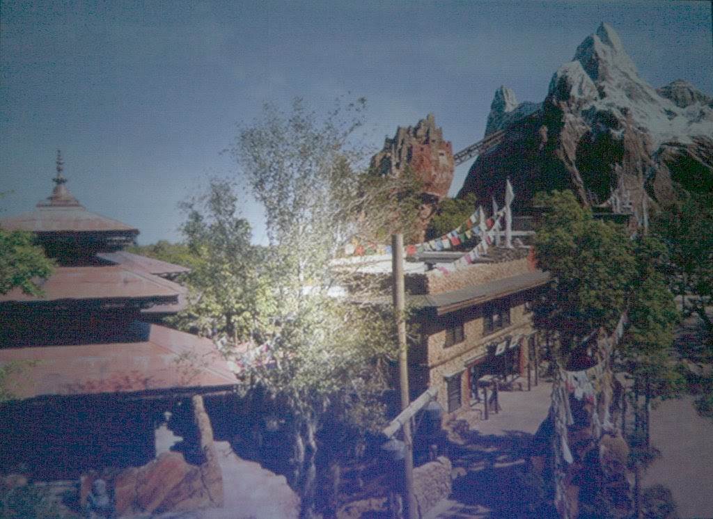 Expedition Everest is based in part on the idea Joe painted in 1991. This is a view from Flame Tree Barbecue to what Everest is now but in this image it is Bhutan instead of Nepal and the Safari Village that was Asia has moved on to the side of Asia instead of that side of island. Joe explained that originally the Safari Village was on the island you would cross over just for the safari. This idea was put away until the idea for developing Expedition Everest arose.