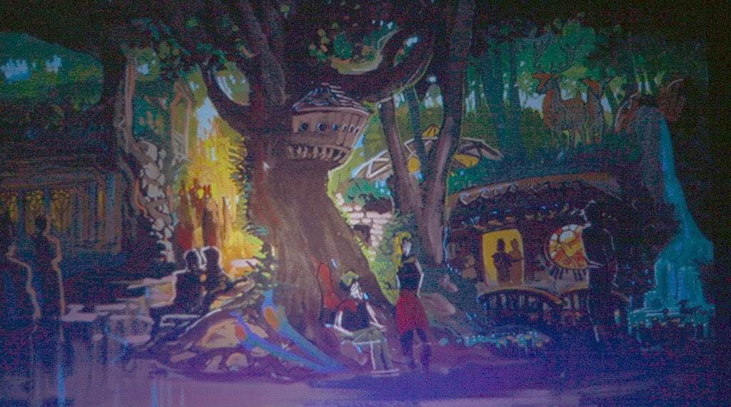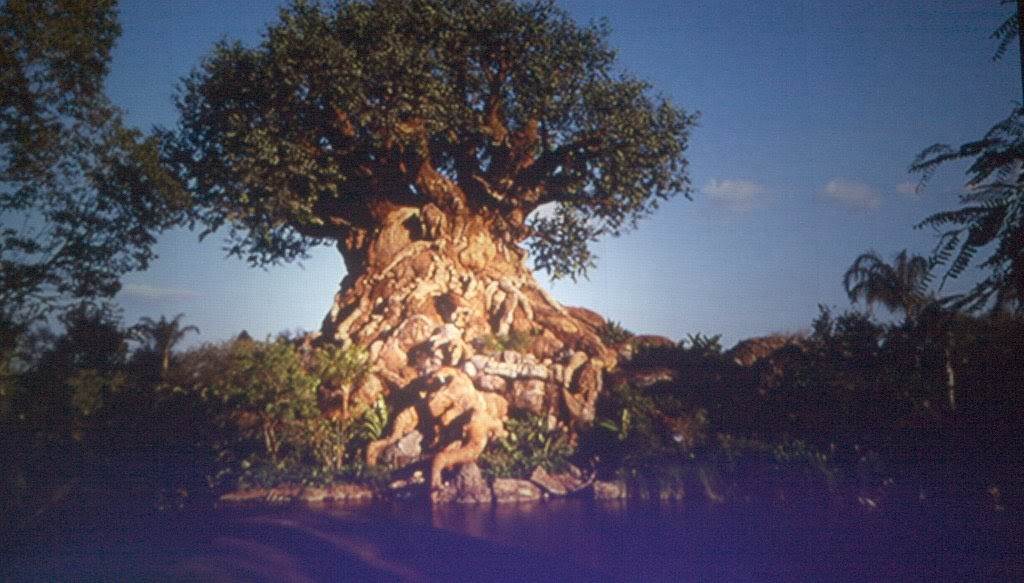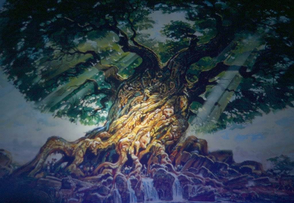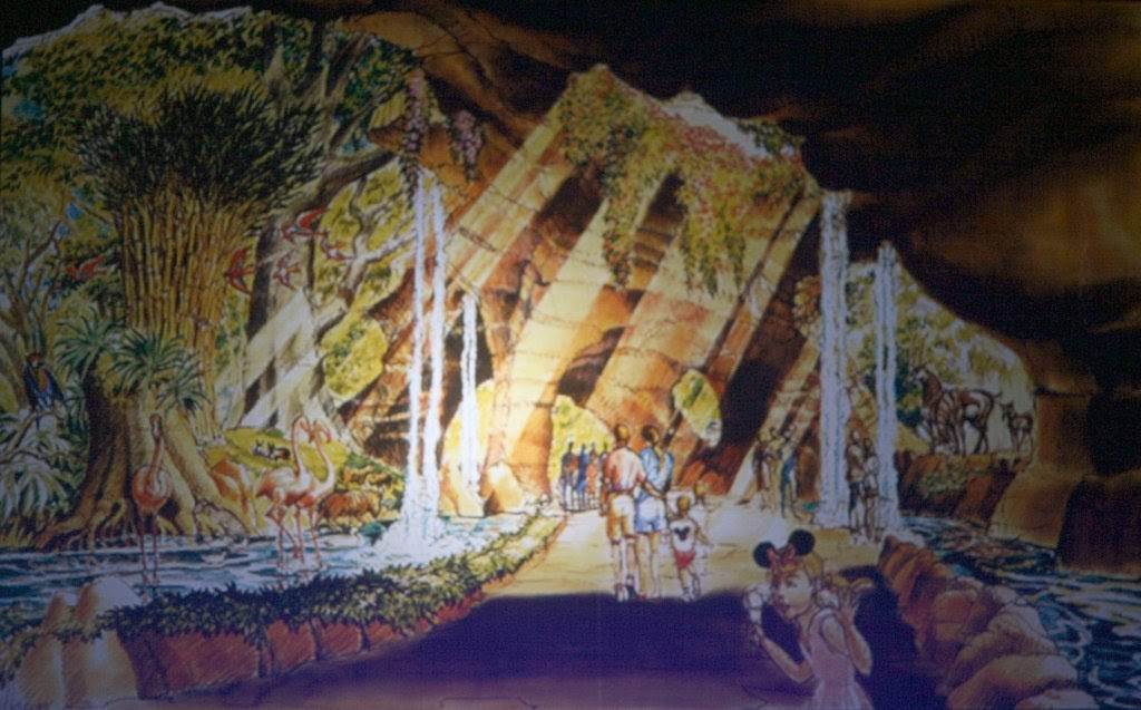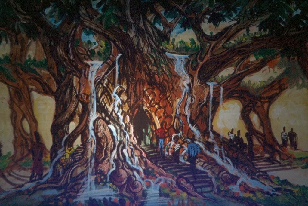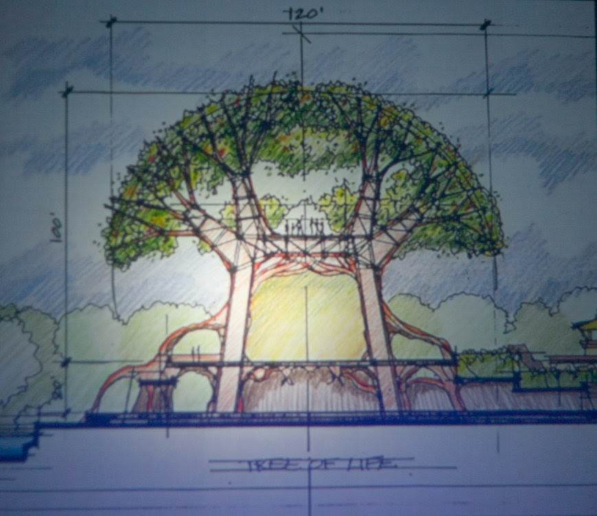 So while the cave grotto was not fully realized it gave birth to The Oasis which guests encounter just after the turnstiles at Animal Kingdom.Initial rendering of the Tree of Life. Looking at the sketch you'll notice the design is for a structure much smaller than even Tarzan's Treehouse. Joe Rohde talked about evaluating concept sketches and looking at the height of adults in the image and then the various other elements within the sketch to determine their eventual size. At this time the tree wasn't planned for the center of the park.