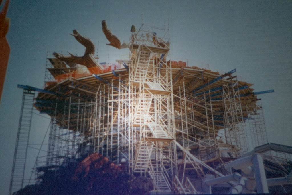 The scaffolding presented a unique challenge to the design team. The workers were unable to view the animals as they were being carved into the tree trunk.