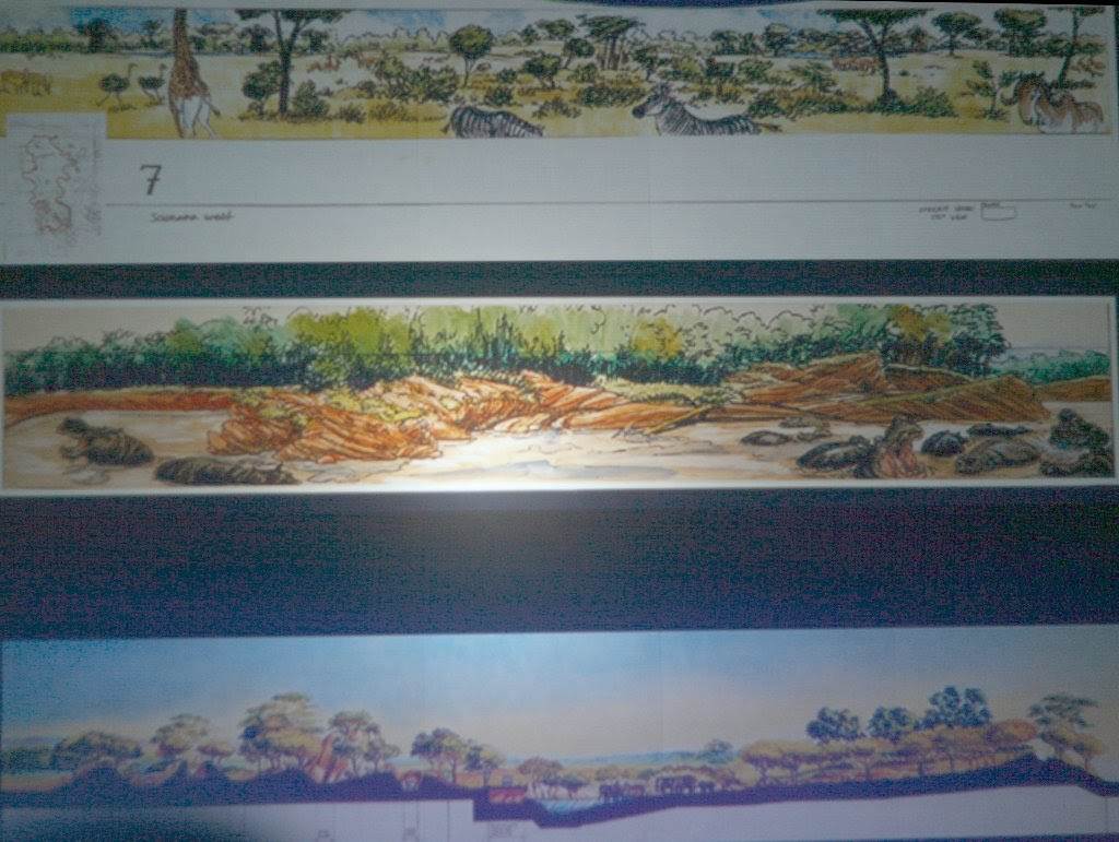 The design team would hold up these 180 degree sketches to get an idea of what types of scenes the guest on the attraction could view as they travelled through Kilimanjaro Safari.