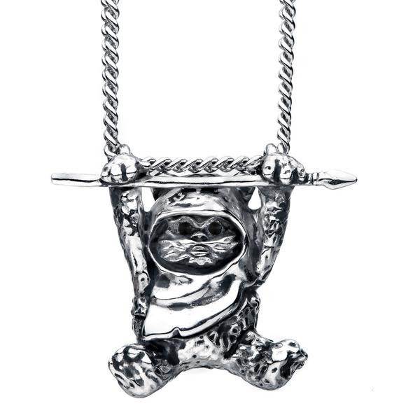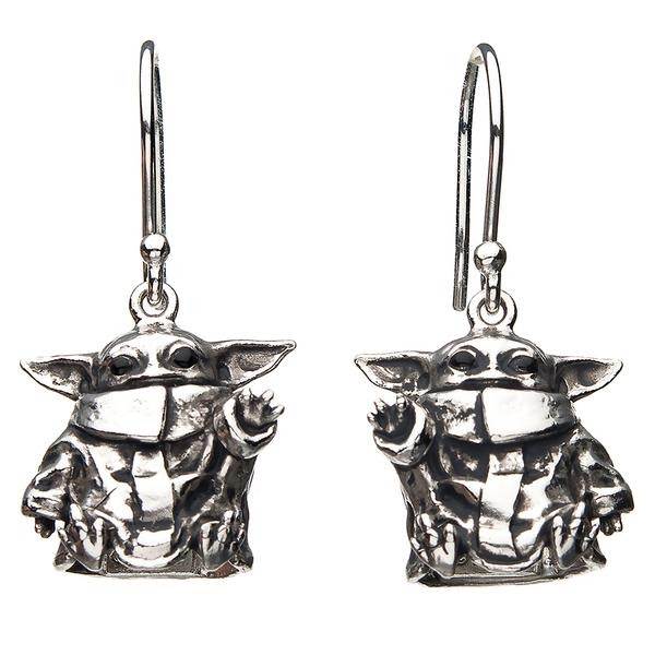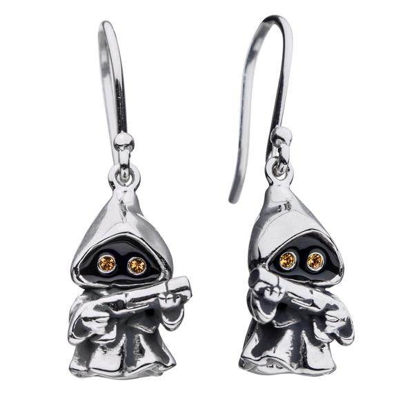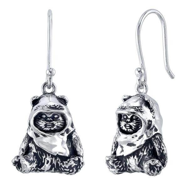“Sculpted in solid sterling silver, Wicket the Ewok sits with legs outstretched. Antiqued to emphasize his adorable facial features and fur texture, these three-dimensional earrings hang from nickel-free sterling silver french hook ear wires and are comfortable for everyday wear.”