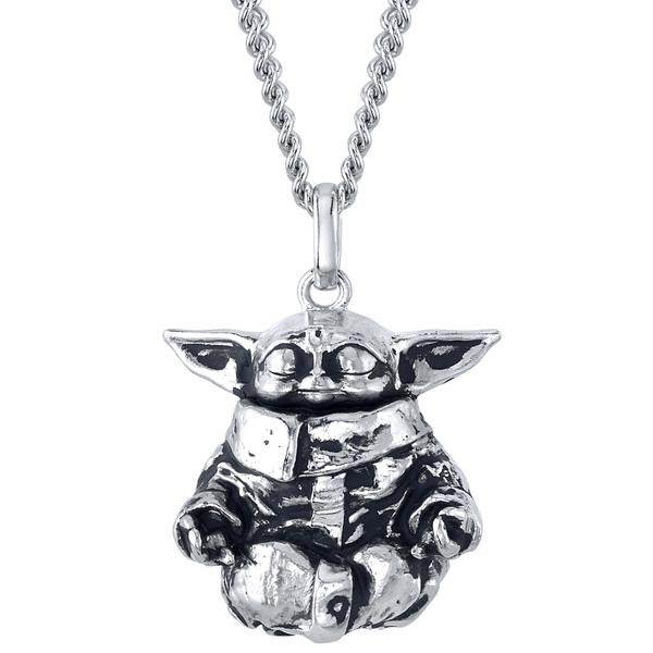 “Carved sterling silver, Grogu is lovingly sculpted in life-like detail, calmly meditating with legs crossed and eyes closed. Antiqued to emphasize its adorable facial features and tiny posed hands, this three-dimensional pendant hangs from a heavy adjustable 24-inch sterling silver curb chain.”