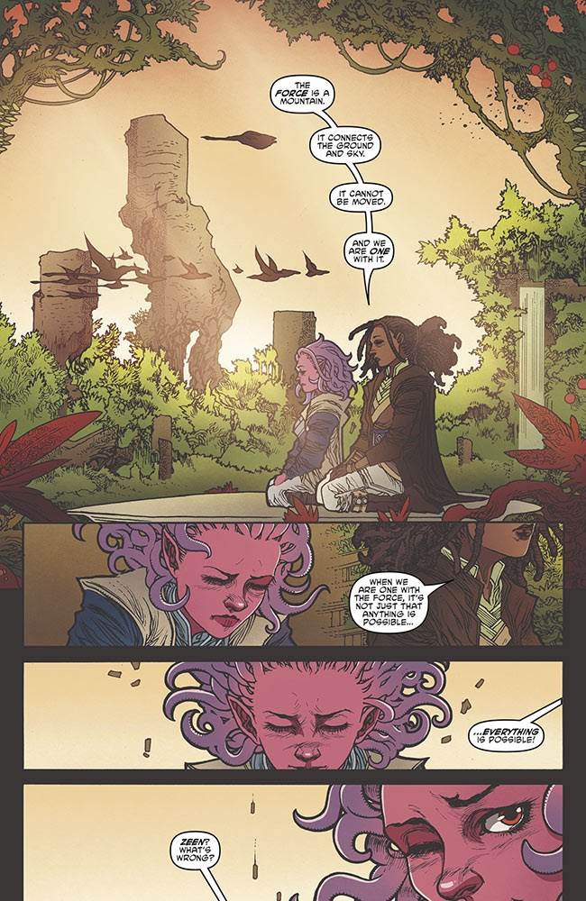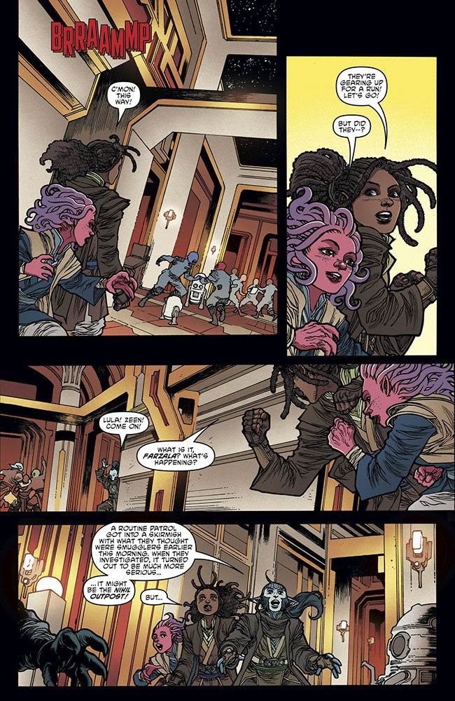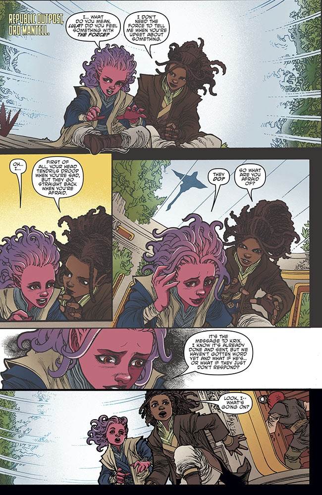 Issue #4 begins at a Republic outpost on the planet Ord Mantell, where the Force-sensitive Mikkian Zeen Mrala is experiencing an academic sojourn with her new Jedi friends. Suddenly the Jedi Knights around her leap into battle aboard their Vector starfighters after discovering the location of a Nihil outpost, though Zeen is left behind with her pet Cham-Cham and Padawans Lula Talisola, Farzala Tarabal, and Qort. Meanwhile, on the garbage moon of Quantxi, Zeen’s estranged companion Krix Kamerat is ordered to kill a local junk dealer who has attempted to flee the nihil’s grasp. Desperate to prove himself to Nihil leader Marchion Ro, Krix tracks down the bird-like alien, who proves to be a more clever and agile prey than he had anticipated.