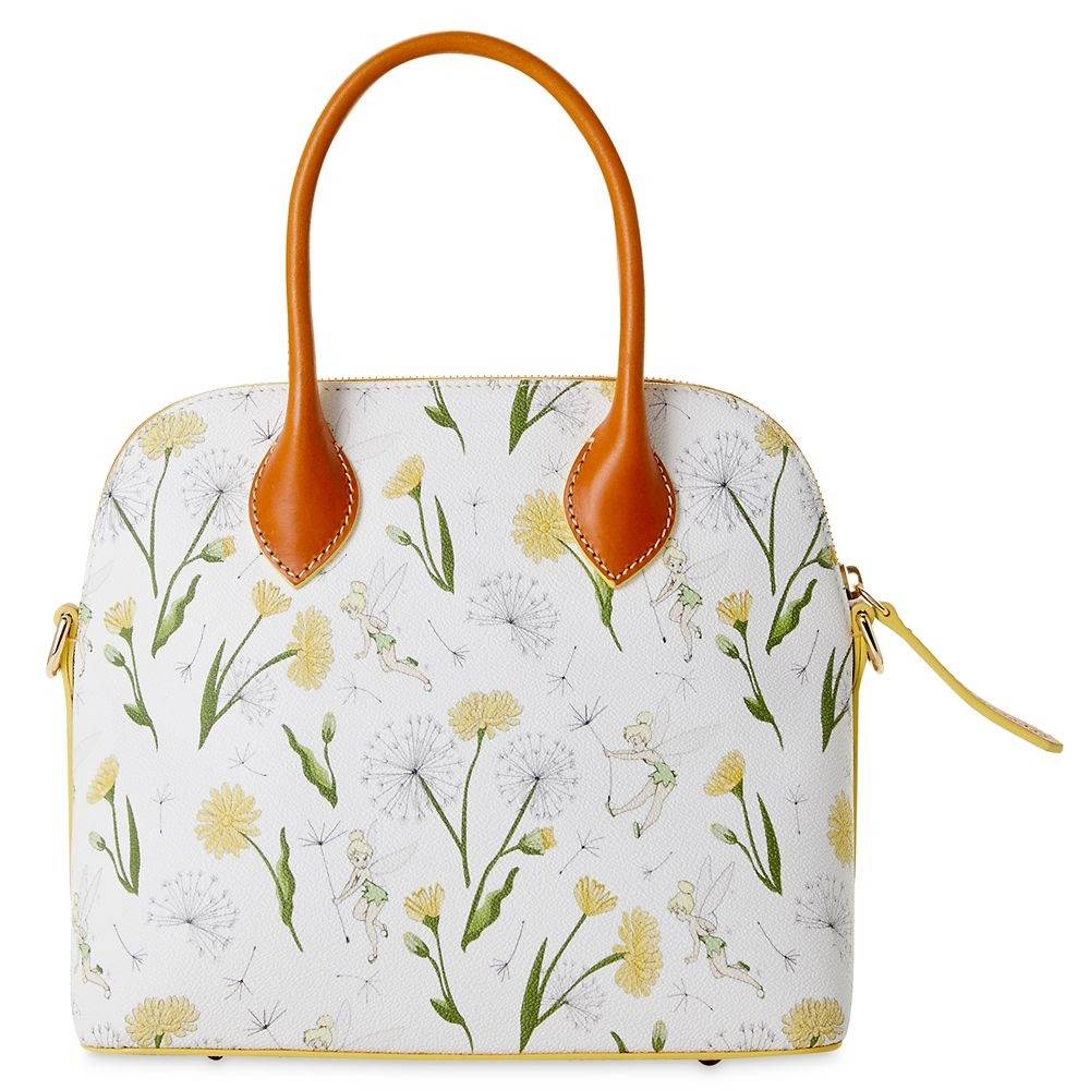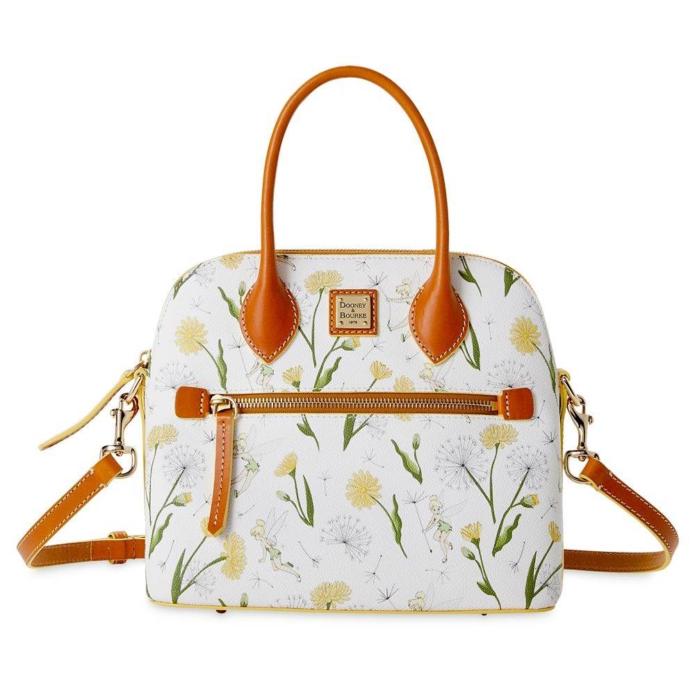 “This stylish satchel by Dooney & Bourke is pixie perfect! An allover pattern of Tinker Bell fluttering among flowers make this bag a flitterific accessory for springtime trips.”
