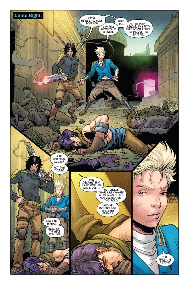 Star Wars: Doctor Aphra #10 opens with the title character caught in the crossfire between the Galactic Empire and the Unbroken Clan, the latter of which has taken siege of a technology firm called De’Rruyet Industries in an attempt to steal an ancient hyperdrive engine left over from the High Republic era. Aphra and her ex-lover Sana Starros bicker about whether they should help rescue the hostages or simply flee the situation, with Sana ultimately nudging Chelli into erring on the side of good. The doctor intervenes in the crisis, offering to repair the so-called Path engine, making it more valuable to the criminal organization led by General Vukorah-- not to mention stopping it from exploding and killing everyone present at the laboratory. Meanwhile at Canto Bight, the assassin Just Lucky and his associate Ariole Yu find themselves ensnared in a trap designed to send a warning to their own gang bosses in the Sixth Kin.