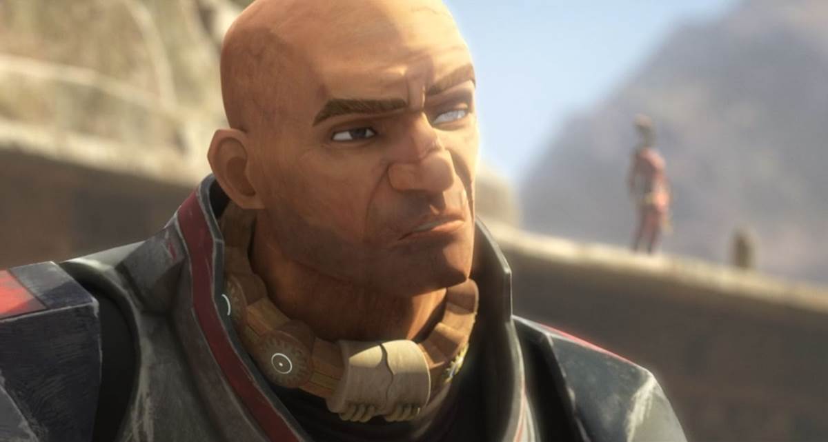 The slaves thank Echo and Omega for their help and ride off on the speeder bikes, then our protagonists reunity as Wrecker is still wearing Muchi down. The clone and the rancor continue trading pouches until they both pass out from exhaustion. “She’s kinda cute up close,” says Omega. In Cid’s office, Bib Fortuna (Matthew Wood) enters flanked by two Gamorrean guards. “I always deliver on my promises. You’ll see,” Cid reassures Fortuna. “This is a delicate mission. Tell Jabba to be patient.” They hear Muchi roar in the distance and run out to find Clone Force 99 returning with the rancor in tow, Omega riding on her back. Cid collects her payment from Bib Fortuna and the Gamorreans take Muchi back to Jabba the Hutt. “You could have told us we were going after a rancor,” says Echo. “Must’ve slipped my mind,” says Cid as she invites Hunter back to her office.