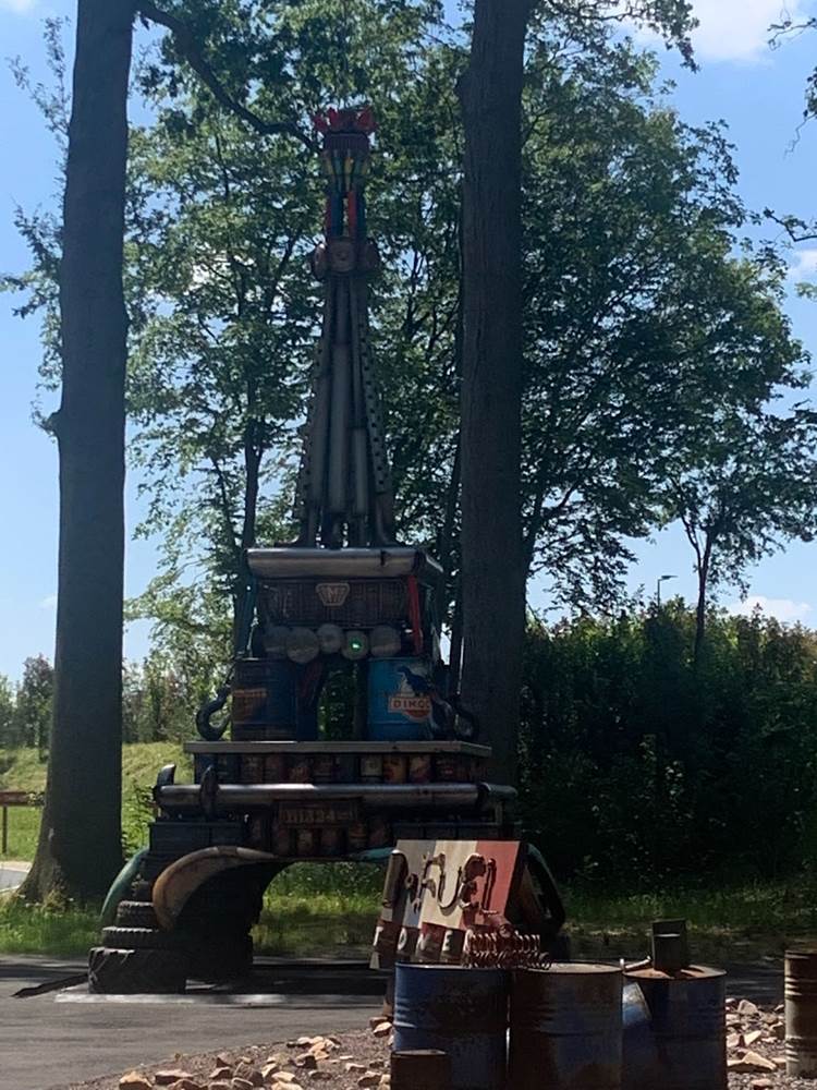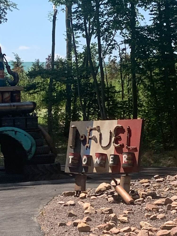 Mater is seen along Route 66, proudly showing off his “I-Fuel Tower” made up of scrap metal and parts.