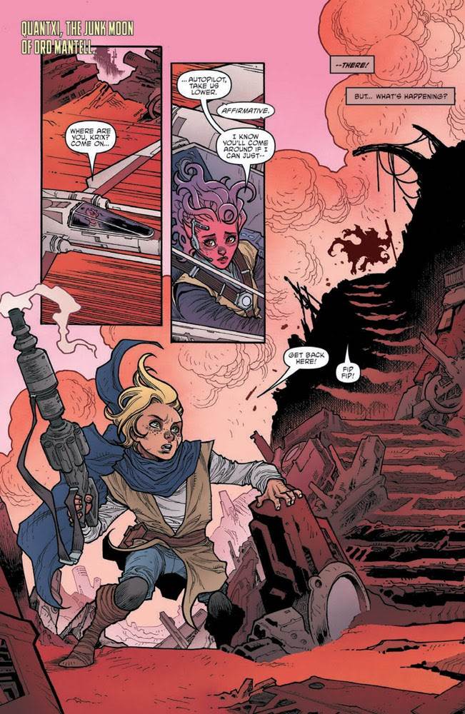 Zeen has traveled to Quantxi-- a junk moon orbiting the planet Ord Mantell-- with her new Jedi Padawan friends Lula Talisola, Qort, and Farzala Tarabal, where the Nihil are about to massacre the native Junk Mavens after their plan has gone awry. The Padawans spring into action to help Zeen escape the chaos, while the newly arrived Jedi Masters Yoda, Torban Buck (AKA “Buckets of Blood”), and Kantam Sy deal with the Nihil themselves, via the help of the wayward Elder Tromak from Zeen and Krix’s home planet of Trymant IV. Naturally Zeen’s attempt to sway Krix toward the light side doesn’t go quite as planned, and Zeen even demonstrates a frightening ability veering toward the other side of the Force along the way. Plus, a Mantellian Savrip shows up (a fearsome creature first seen as a holochess piece in the Millennium Falcon’s Dejarik board) and wreaks all sorts of havoc.