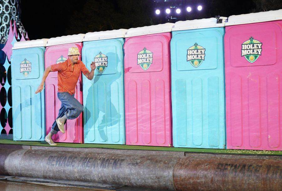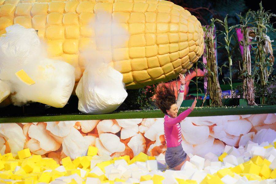 Advertising for the new season promises 12 new holes, but the new hole that seems to be the marketing darling of the new season is Corn Hole. Similar to last season’s Hole Number Two which sees contestants putt down a long straight and narrow green and then have to sprint past obstacles (namely, port-a-potty doors flying open by Holey Moley mascot occupants). In the new hole, the port-a-potties have been replaced by a lengthy corn cob adjacent to a pit of foam kernels. At a certain point, thanks to an attached microwave, the kernels on the cob will blast suddenly into popcorn and will (likely) knock contestants off the narrow green with force, launching them into the kernels below.