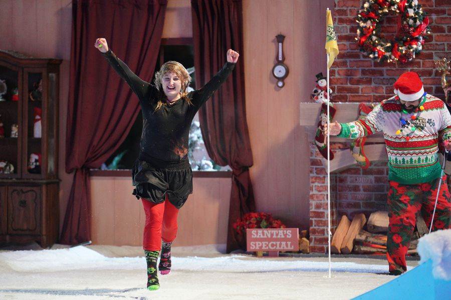Though Holey Moley is a fantastic Summer hit, it’s never too early for Christmas, and Ho Ho Hole brings in the holiday cheer, though it may seem a little familiar to regular viewers of the show. Contestants putt up a wall and watch it cascade down Plinko-style, hoping to go right down the chimney for a better spot on the green, or at least the “nice: slot instead of the “naughty” one. Then, to reach their ball, players must hop aboard Santa’s sleigh and get whisked away to the North Pole, or into it rather. If they end up in the water, it’s a stroke penalty when they make it to the holiday themed living room green. Fans of the show may think that this sounds awfully similar to Polcano, but don’t worry, they aren’t the only ones. Rob and Joe are also quick to notice the striking similarities to the hole featured in prior seasons.