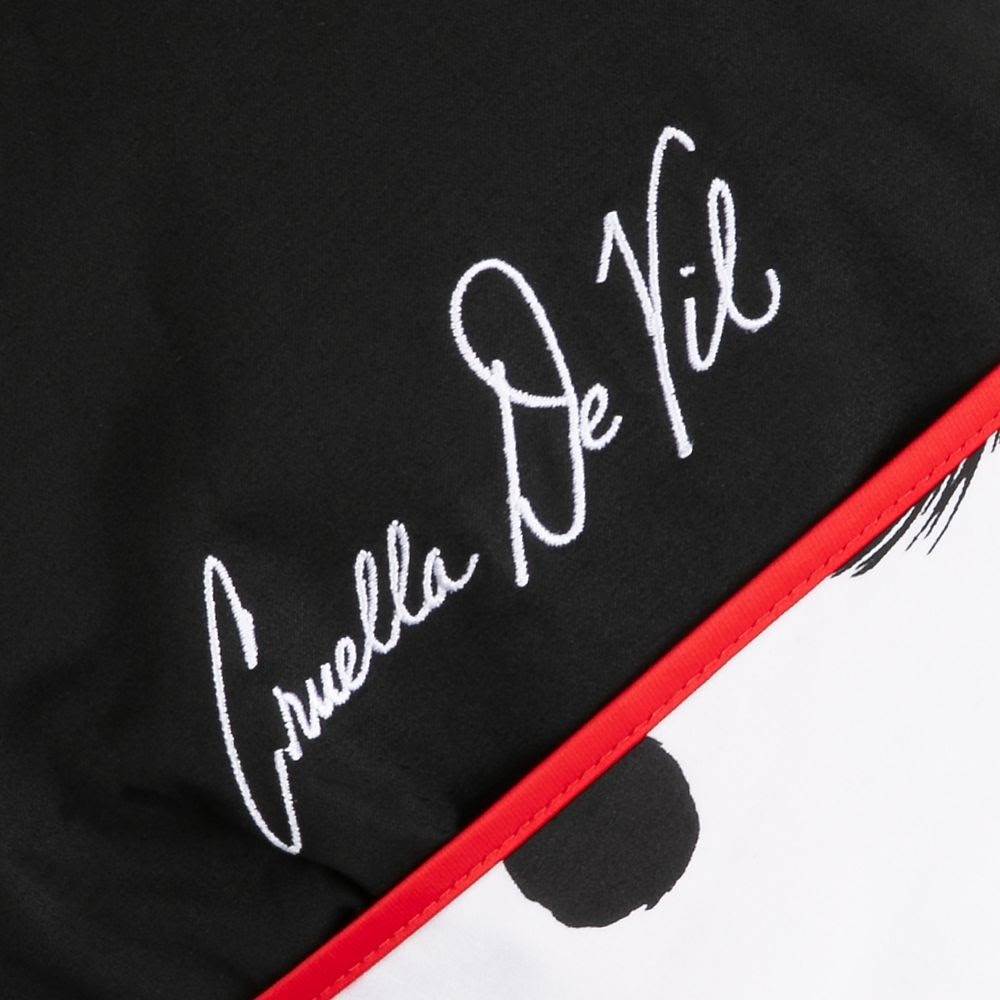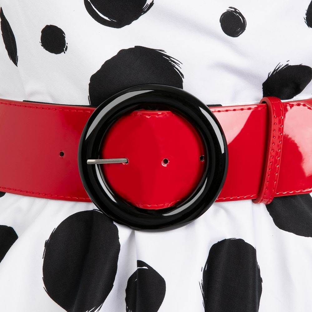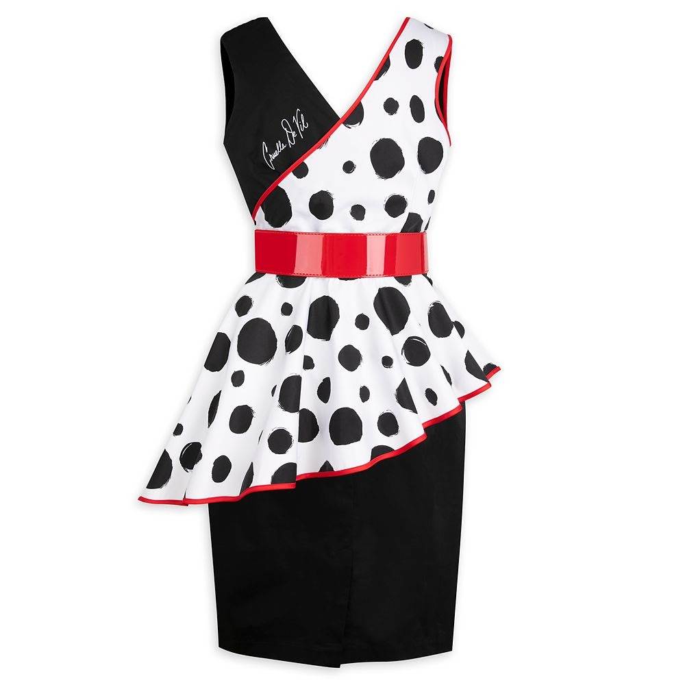 - The tailored cocktail dress features a v-neckline bringing the left and right sides together. The bottom and left side of the dress are all black while the right side shows off a dalmatian print and a flared hem accented with red piping. Cruella’s signature also appears on the left side, mid back.