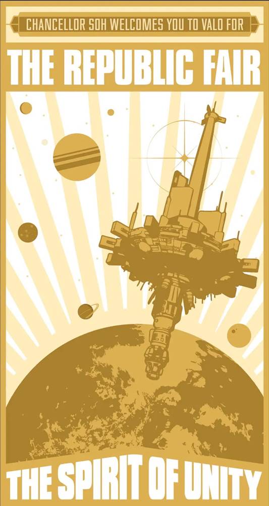 Scott: I can’t remember who came up with the idea for the Republic Fair. It was quite early on in the process, and it was that sense of a brave new world that World’s Fairs in the past have brought: the idea of progress and showing the world-- in the case of World’s Fairs-- what a country or a society or an age will bring… what they can do. We wanted to open that up to the galaxy, and it tied in very well to the entire idea of [Chancellor] Lina Soh’s Great Works that she was running through. All of us are fascinated by the World’s Fairs of old. I’ve got books galore of pictures [of the World’s Columbian Exposition in] Chicago, and also London Exhibitions over here, and Paris from the Victorian era. That’s where it originally came from. It’s going to have an effect on everything, just in the same way as the Great Disaster in the first wave affected everything around it. Some of the stuff actually takes place during it, and other elements take place as the dust has settled.