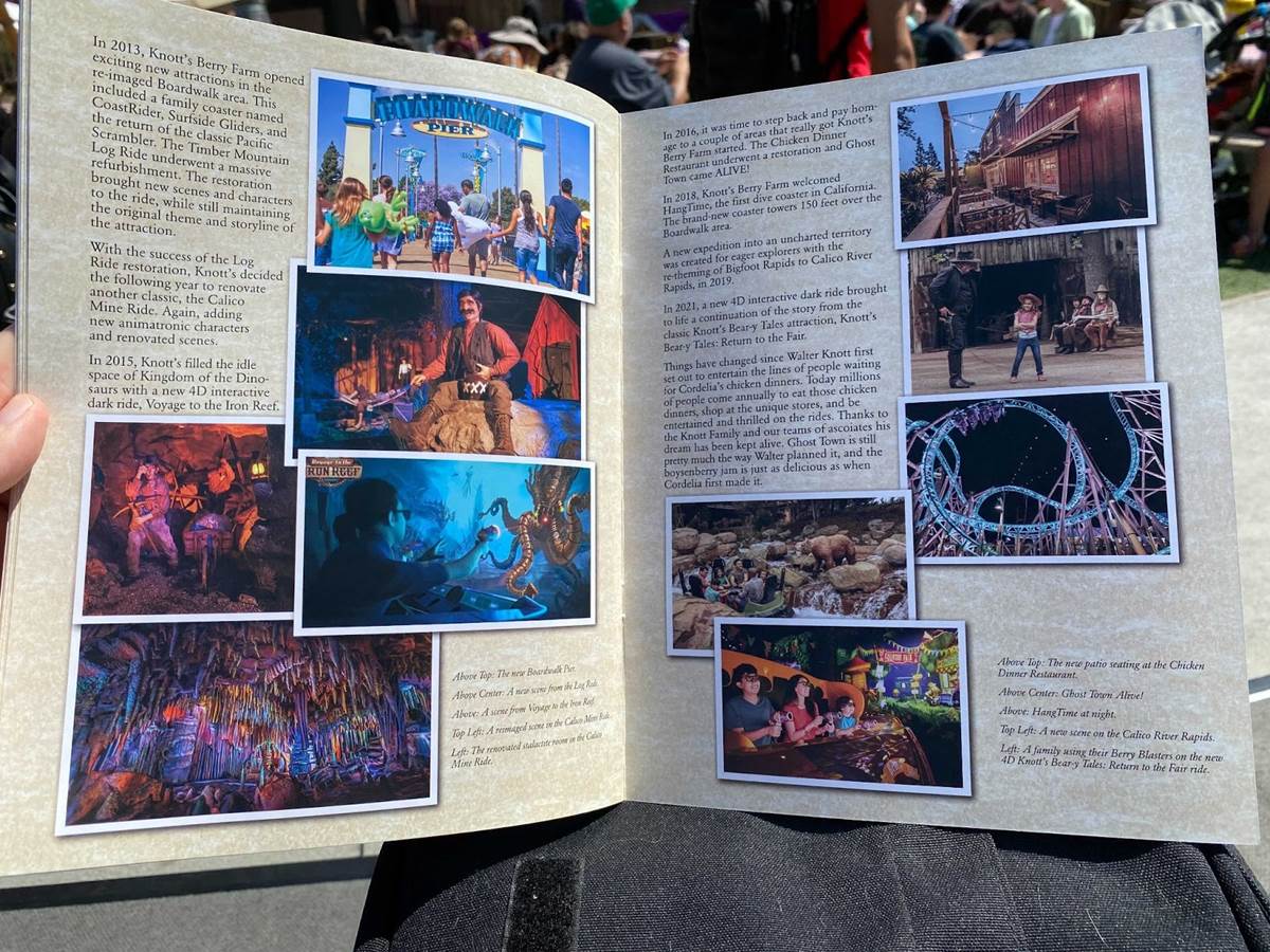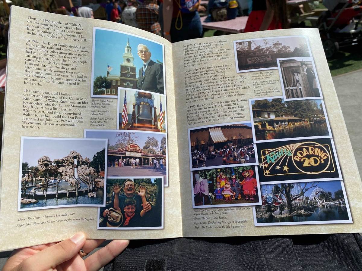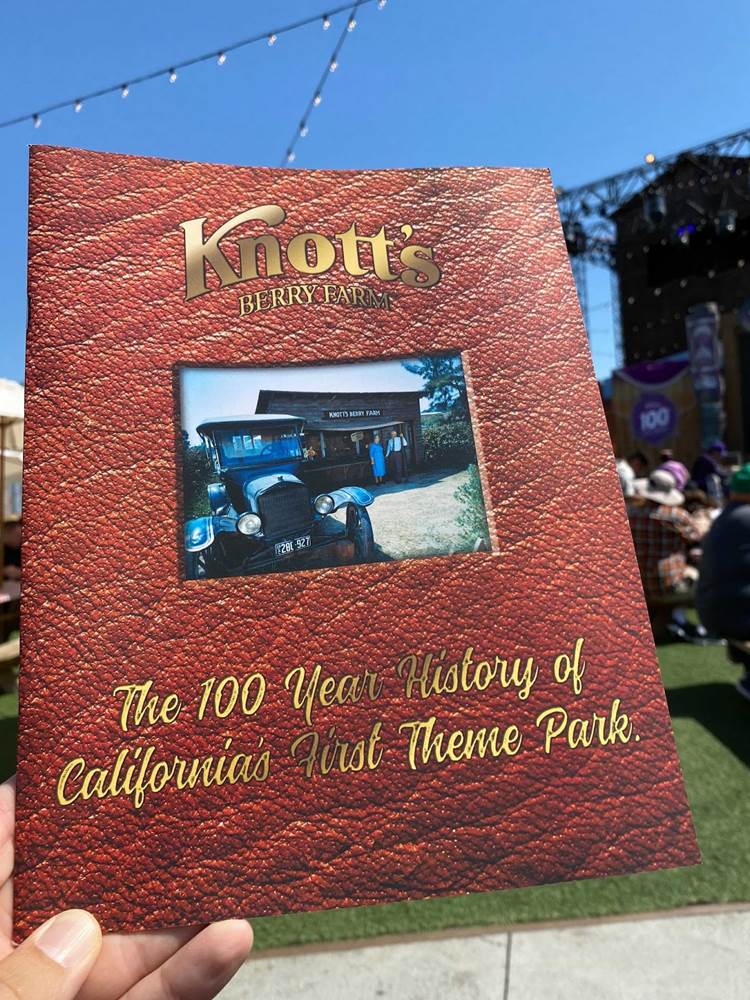 Items placed in the time capsule included a nugget of fool’s gold, a tube from Knott’s Soak City water park, a menu from Mrs. Knott’s Chicken Dinner Restaurant, boysenberry seeds and a jar of dirt from the landscaping department, garters from the Calico Saloon’s showgirls, a bridle from the stagecoach, a Berry Blaster from Knott’s Bear-y Tales: Return to the Fair, a Snoopy plush, a piece of wood and nails from the Ghost Rider roller coaster, cleaning supplies and toilet paper from park services, a basketball from the Boardwalk games, and a banner signed by Knott’s Berry Farm’s 2021 staff. Plus, everyone in attendance posed for a photo to be placed inside the barrel as well. Prior to the ceremony, I was also given a copy of the Knott’s Berry Farm 100th anniversary program, which contains a lot of great photos and information about the history of the famous California theme park.
