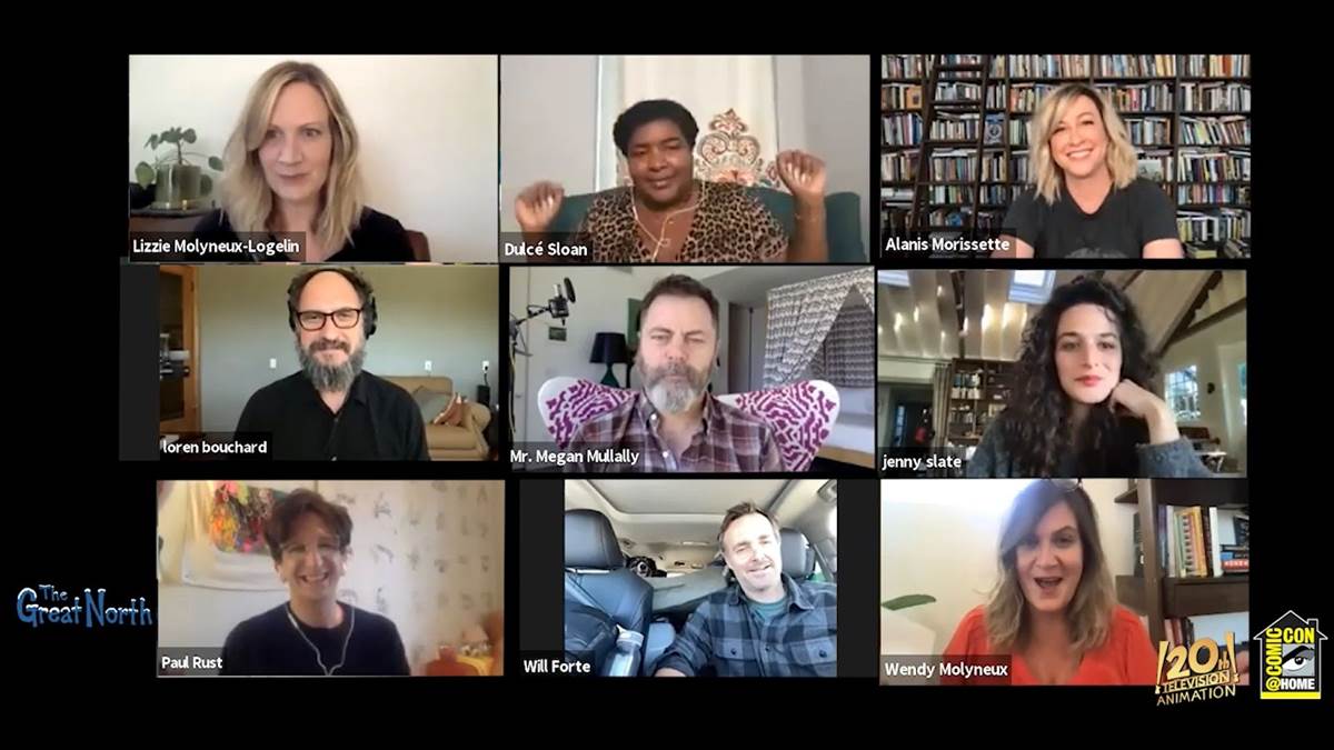 Comic-Con@Home 2021 continued this afternoon with a panel discussion of FOX’s animated sitcom The Great North, featuring creators and executive producers Wendy Molyneux and Lizzie Molyneux, executive producer Loren Bouchard, and cast members Nick Offerman (who voices the character of Beef Tobin), Jenny Slate (Judy Tobin), Dulcé Sloan (Honeybee Shaw), Will Forte (Wolf Tobin), Paul Rust (Ham Tobin), and Alanis Morissette (as herself).
