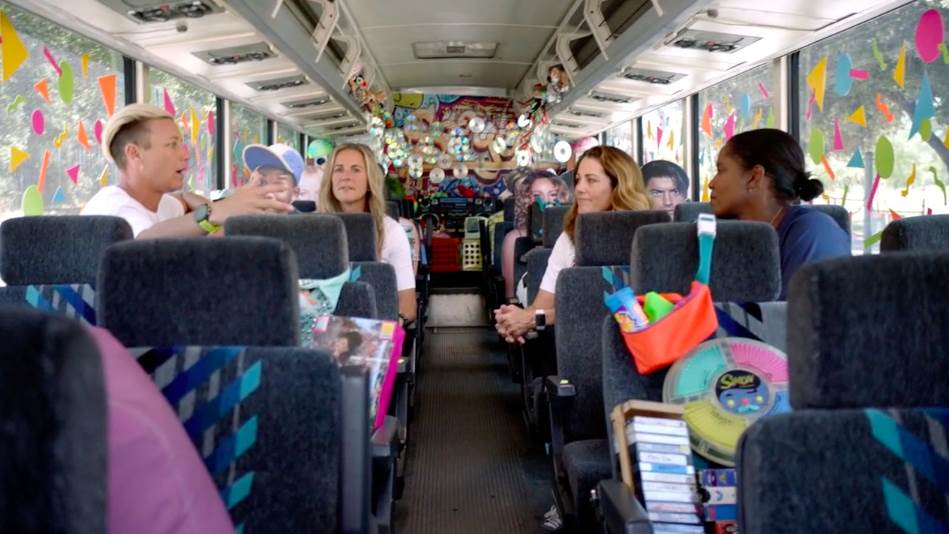 Abby then gets behind the wheel of a bus that looks like it was taken right out of the ‘90s. In fact, it’s loaded with memorabilia from the decade including cardboard cutouts of celebrities like Will Smith, Brendan Fraser and the Spice Girls, as well as VHS tapes, roller blades, Power Rangers and so much more.