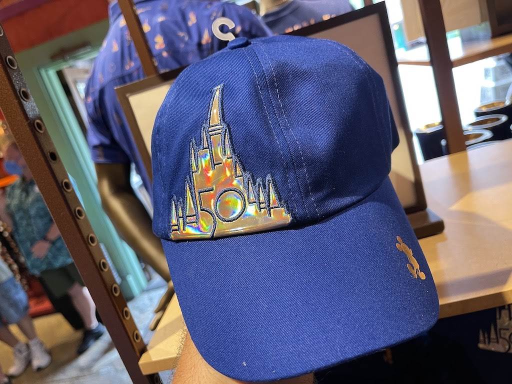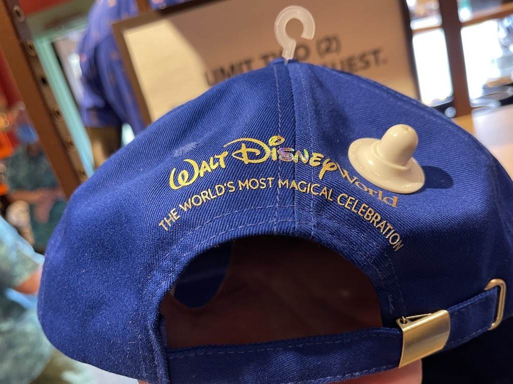 Hat’s off to the best vacation destination ever! Show your love for Disney with a blue baseball cap that features a light-catching golden Cinderella Castle patch on the right side and a gold foil Mickey Mouse silhouette on the side of the brim. The back has the resort logo and reads “The World’s Most Magical Celebration.” Each hat sells for $29.99
