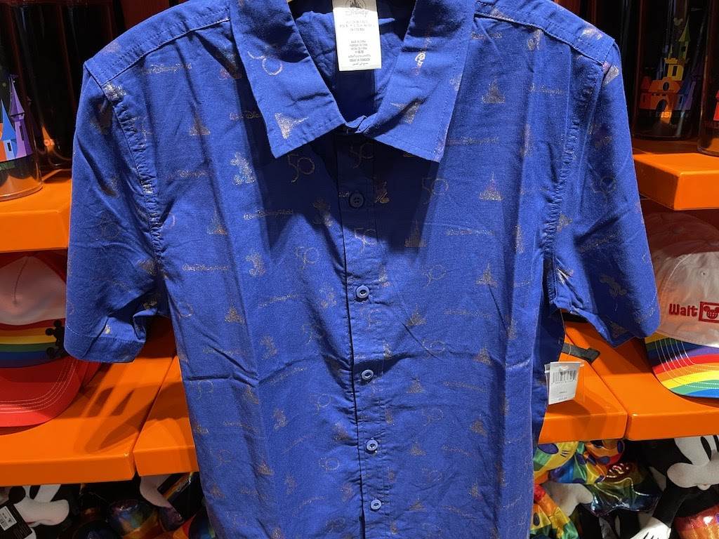 This royal blue dress shirt is the perfect way to celebrate WDW’s 50th and works in both casual and dressy situations. The pattern of this top is nicely spaced out and includes iridescent icons of Mickey Mouse, “50,” “Walt Disney World,” and Cinderella Castle. Get yours for $64.99.